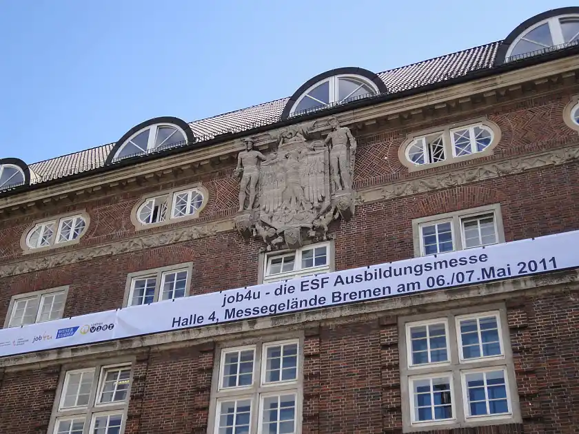 Ein repräsentativer Balkon, darüber ein großes Wappen, ein stattliches Gebäude… nein, die Rede ist nicht vom Buckingham Palast – was aus aktuellem Anlass ja sehr naheliegen könnte. Der Balkon befindet sich auch nicht in London, sondern an einem Gebäude am Bremer Bahnhofsplatz. Er ist damit auch nicht der Ort für Küsse des königlichen Nachwuchses, sondern seit heute Ort für einen wichtigen Hinweis für die Zukunft junger Menschen: ein Transparent weist dort in großen Buchstaben auf die job4u-Ausbildungmesse am 6. und 7. Mai 2011 auf dem Bremer Messegelände hin.