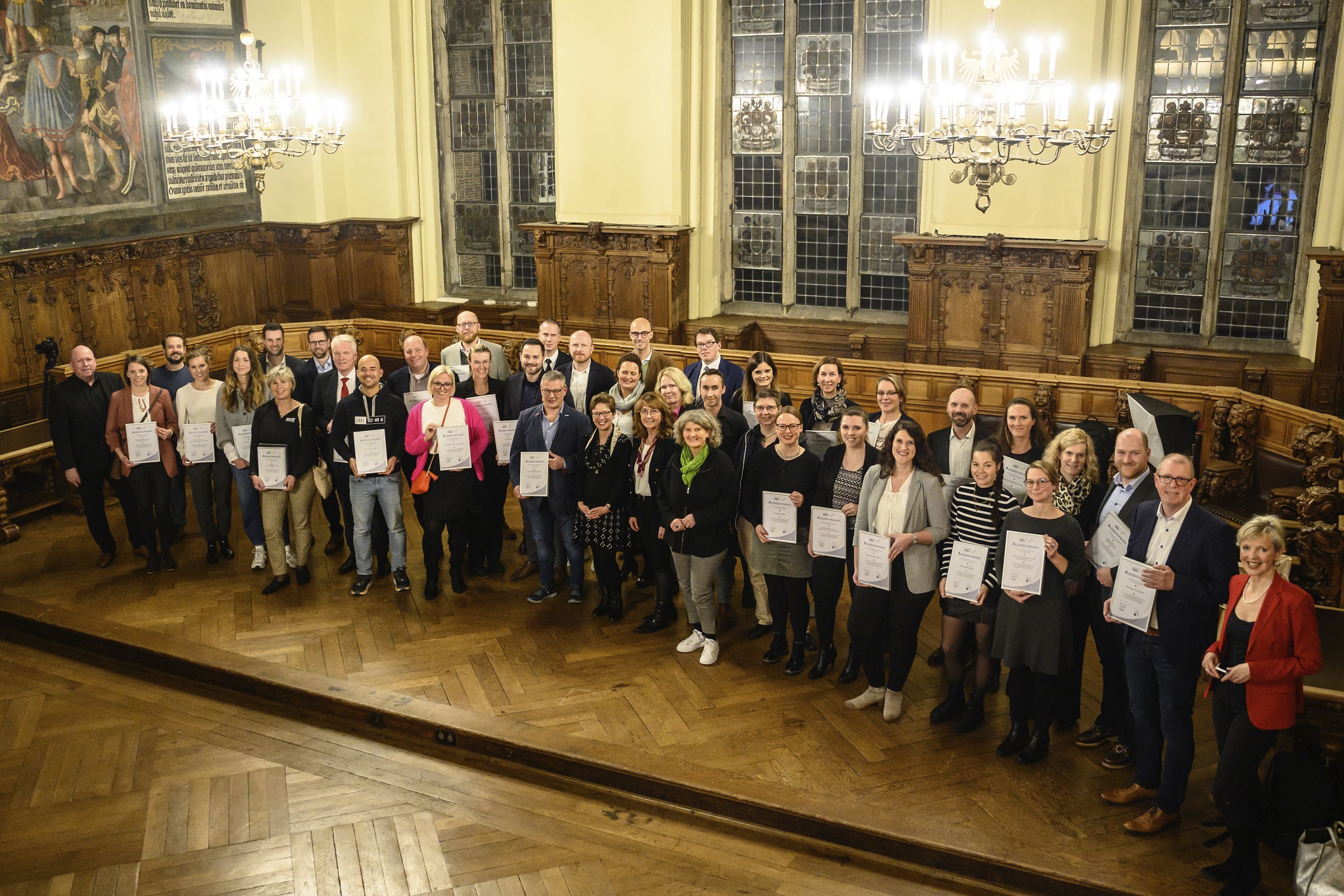 Die Vertreterinnen und Vertreter der Unternehmen in der Oberen Rathaushalle zusammen mit Senatorin Dr. Claudia Schilling, Arbeits-Staatsrätin Karin Treu und Frauenbeauftragter Bettina Wilhelm (Bildmitte, vordere Reihe, ohne Urkunden v.l.n.r,). Foto: Kerstin Rolfes