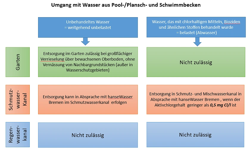 Solch behandeltes Beckenwasser ist Abwasser, es gilt als belastet und muss über den Schmutz- oder Mischwasserkanal entsorgt werden. Vor der Einleitung in die öffentliche Kanalisation ist die zuständige Behörde, in diesem Fall hanseWasser Bremen zu kontaktieren, um den weiteren Ablauf zu besprechen.
