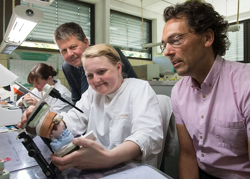 Am ersten Tag seiner Tour schaut Umweltsenator Lohse einem Mitarbeiter des Rübeling Dental-Labors bei der Arbeit über die Schulter.