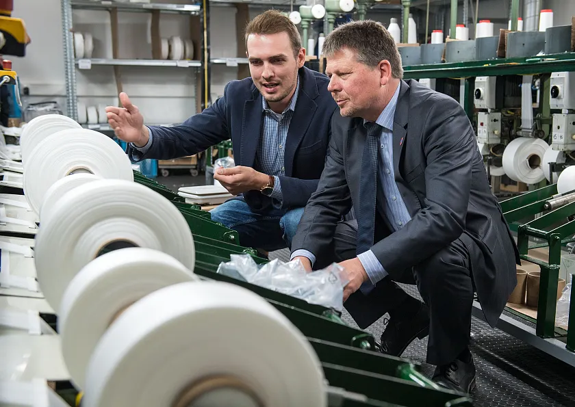 Robert Erichsen von der Statex Produktions & Vertriebs GmbH (r.) gibt anlässlich des Besuchs von Umweltsenator Dr. Joachim Lohse (l.) Einblick in die Entstehung von Hightech-Garnen made in Horn-Lehe