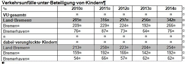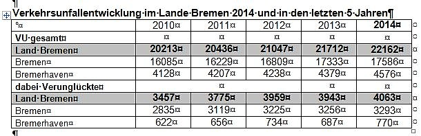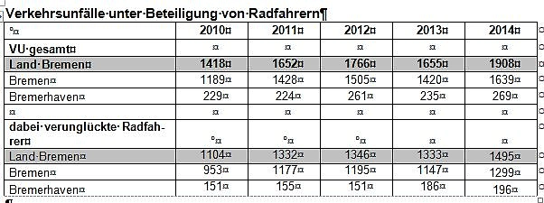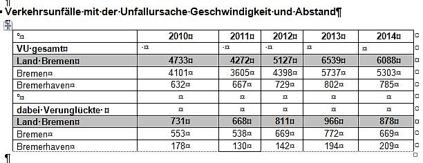Im vergangenen Jahr ist bei der Polizei des Landes Bremen mit "Artus" ein neues, flexibleres Vorgangsbearbeitungssystem eingeführt worden. Damit einhergehend werden seitdem unter anderem die Verkehrsunfallzahlen anders, nämlich differenzierter erhoben. Durch die Umstellung auf ein anderes Zählverfahren, haben sich die Vergleichszahlen zu den Berichten der Vorjahre verändert. Wir weisen darauf hin, dass damit ein Vergleich mit den Vorjahren nur noch bedingt zulässig ist.