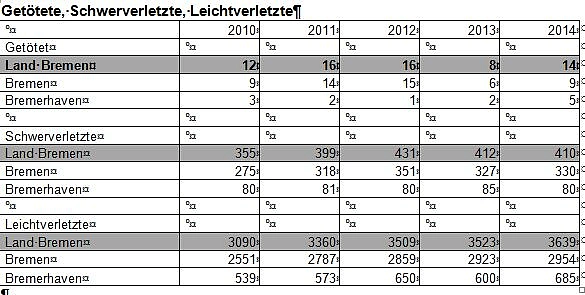 In Bremerhaven hat sich die in der Statistik ausgewiesene Zahl der Getöteten auch deswegen deutlich erhöht, weil ab 2014 Unfälle auf der Autobahn, die im Bremerhavener Stadtgebiet verläuft, ebenfalls berücksichtigt werden. Drei Menschen starben in Bremerhaven auf der Autobahn. Während die Zahl der Schwerverletzten fast konstant geblieben, und in Bremerhaven sogar gesunken ist, ist die Zahl der Leichtverletzten und Getöteten wieder leicht angestiegen.