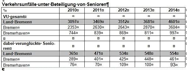 Die Verkehrsunfälle unter Beteiligung von Senioren sind in Bremen und Bremerhaven stark angestiegen. Dies hängt auch damit zusammen, dass präventive Maßnahmen diese Zielgruppe schlecht erreichen. Insbesondere Menschen ab 75 Jahren und älter sind für die Polizei insgesamt schlecht erreichbar. Spezielle Probleme oder auch Unfallbrennpunkte sind nicht erkennbar. Die Präventionsarbeit in diesem Bereich wird fortgeführt.