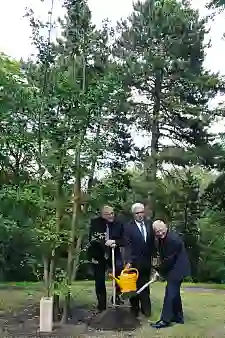 Bei der Einpflanzung des Ginkgobaums in den Wallanlagen: Karl Zwermann, Präsident der Deutschen-Gartenbau-Gesellschaft, Heribert Eschenbruch und Baustaatstrat Wolfgang Golasowski (v.r.)