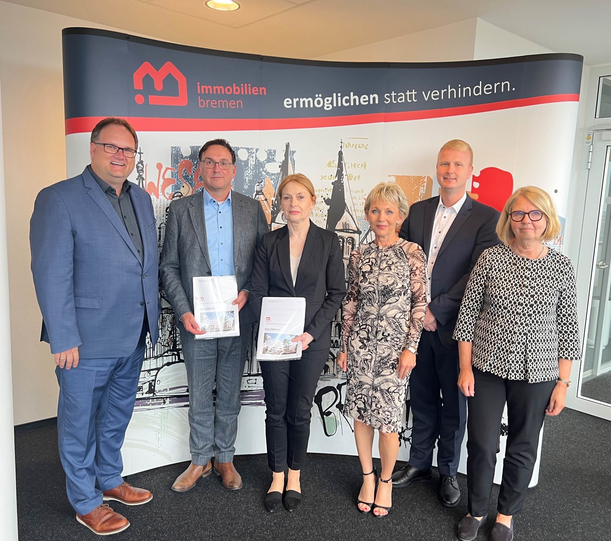 Nach der Vertragsunterzeichnung für den Neubau der Ganztagsschule am Alten Postweg (von links): Finanzsenator Björn Fecker; Carsten Hense (Geschäftsführer Goldbeck Public Partner GmbH); Susanne Kirchmann (Geschäftsführerin Immobilien Bremen); Kerstin Brockmüller (Abteilungsleiterin Projektsteuerung bei IB); Tim Heinemann (PD – Berater der öffentlichen Hand GmbH) und Regine Dohle (Geschäftsführerin Dohle+Lohse_Architekten). Foto: Immobilien Bremen/Cecere