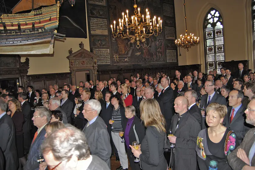 Volles Haus in Bremens schönstem Ambiente: Rund 600 Gäste waren heute (20.1.2011) der Einladung ins Rathaus zum traditionellen Neujahrsempfang des Bremer Senats gefolgt. Bürgermeister Jens Böhrnsen begrüßte die Vertreterinnen und Vertreter aus Politik, Wirtschaft, Kultur und anderen gesellschaftlichen Bereichen. Für die musikalische Umrahmung der festlichen Zusammenkunft sorgte ein Ensemble der Bremer Philharmoniker. „Bremen und Bremerhaven können mit Zuversicht und Vertrauen in die Zukunft sehen.“ Mit Bedacht wiederholte Bürgermeister Jens Böhrnsen in seiner Ansprache diesen Satz aus seiner Vorjahresrede. Dabei verwies er auf die guten Wirtschaftsdaten für Bremen: „Unser größter privater Arbeitgeber Mercedes baut so viele Autos wie noch nie - 300 000 sollen es in diesem Jahr werden. Auch die Stahlwerke haben im Dezember soviel produziert wie nie“. Böhrnsen verwies auch auf den sich erholenden Umschlag in den bremischen Häfen sowie den Aufwind, den die Luft- und Weltraumbranche verspüre. Ausdrücklich dankte er den Unternehmen sowie den Arbeitnehmerinnen und Arbeitnehmern für diese guten Nachrichten.