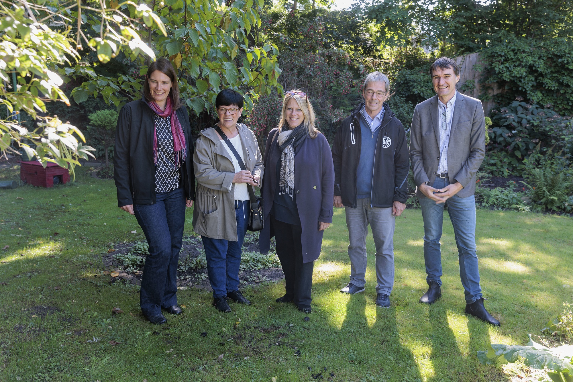 Mitglieder der neuen Sturmflutpartnerschaft in Bremen (v. l.): Dr. Lucia Herbeck und Dr. Maike Schaefer, Senatorin für Klimaschutz, Umwelt, Mobilität, Stadtentwicklung und Wohnungsbau, sowie Elke Müller, Vorsitzende des Kleingartenvereins Gartenfreunde Weserlust, und Axel Viereck, Vorstand des Vereins FC Union60 Bremen. Foto: BREsilient, Fotograph: Jörg Sarbach