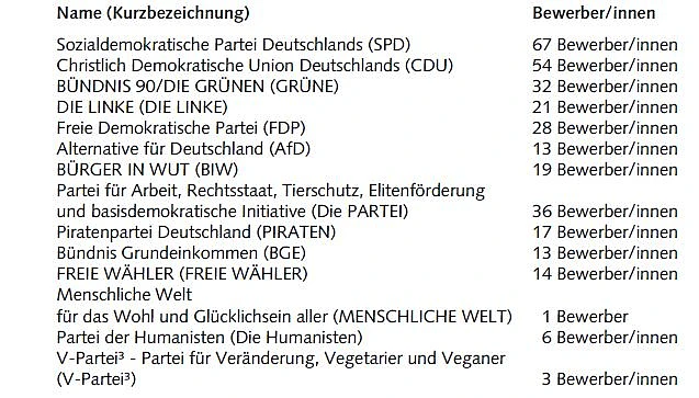 Die 14 Parteien und Wählervereinigungen haben insgesamt 324 Kandidatinnen und Kandidaten aufgestellt – 219 Männer und 105 Frauen.