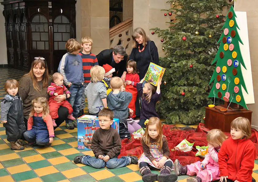 Dreieinhalb Wochen lang erstrahlten im Rathaus Kinderaugen, wenn vor dem großen Tannenbaum ein Adventskalendertürchen geöffnet wurde und ein Gutschein in Höhe von 250,- Euro zum Vorschein kam. Heute (23.12.11) fand die schöne Aktion nun ihr Ende. Die Kinder der Kindergruppe Momo öffneten die letzte Tür und beendeten somit den bunten Reigen für den guten Zweck. Täglich von Montag bis Freitag waren Kindergruppen ins Rathaus gekommen, um für ihre Einrichtung den gespendeten Betrag sowie zusätzlich Spielsachen und Naschereien abzuholen.