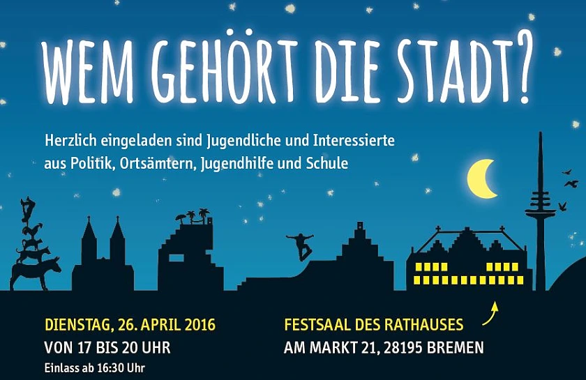Gehört die Stadt auch den Jugendlichen? Haben Jugendliche Möglichkeiten, eigene Ideen zu verwirklichen? Wie engagieren sie sich in Bremen? Politisch? Gelingt es dabei jugendliche Flüchtlinge anzusprechen? Bürgermeister Dr. Carsten Sieling lädt engagierte Jugendliche, sowie ihre Unterstützerinnen und Unterstützer aus Jugendhilfe, Ortsämtern und Politik ins Rathaus ein. Jugendliche aus neuen und bereits bekannten Stadtteil-Projekten berichten von ihren Erfahrungen und kommen mit Carsten Sieling ins Gespräch: Warum engagieren sich junge Menschen? Wieweit können sie entscheiden? Wo können sie ihre Ideen verwirklichen und wann stoßen sie auf Hürden?
