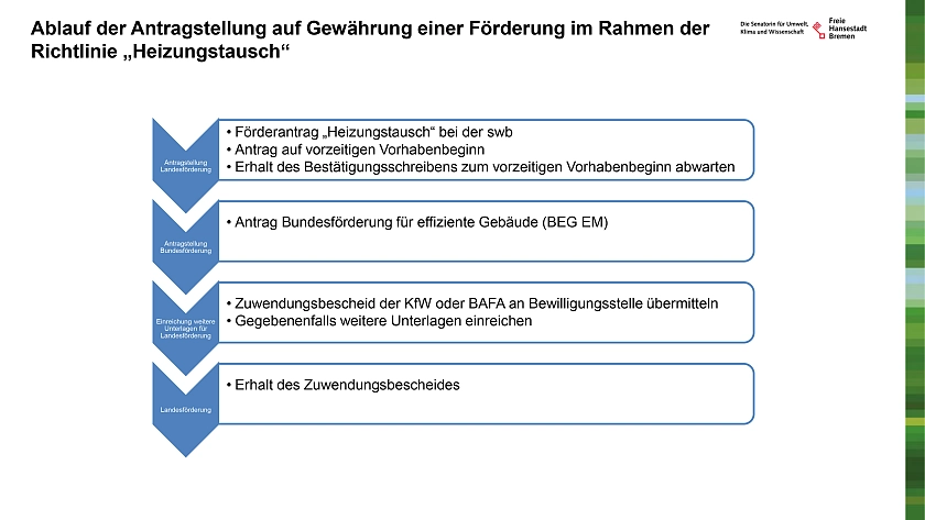 Weitere Informationen zum Antragsverfahren sowie die Antragunterlagen finden Sie auf den Seiten der Senatorin für Umwelt, Klima und Wissenschaft: umwelt.bremen.de/klima/klima-energie/waermewende-2383782.