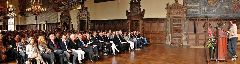 03.09.2012Der Blick in die Obere Rathaushalle zeigte: Bürgermeisterin Karoline Linnert hatte 232 neu eingestellte Auszubildenden des bremischen öffentlichen Dienstes am 03.09.2012 zum Empfang geladen – und alle waren gekommen. Viele waren auch der Einladung gefolgt, Angehörige oder Freunde mitzubringen, und so herrschte bei den rund 500 Gästen während des musikalisch umrahmten Festaktes aufmerksame Spannung in „der guten Stube“ des Rathauses.