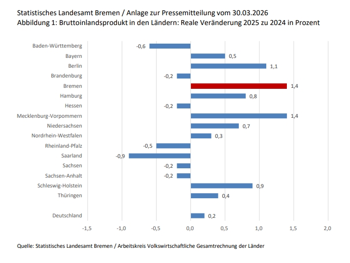 Das Bruttoinlandsprodukt ist im Land Bremen zwischen 2024 und 2025 preisbereinigt um 1,4 Prozent gewachsen. Nach Mitteilung des Statistische Landesamtes Bremen und des Arbeitskreises "Volkswirtschaftliche Gesamtrechnungen der Länder" nahm die Wirtschaftsleistung im Zwei-Städte-Staat damit deutlicher zu als auf Bundesebene, wo der Zuwachs bei 0,2 Prozent liegt.