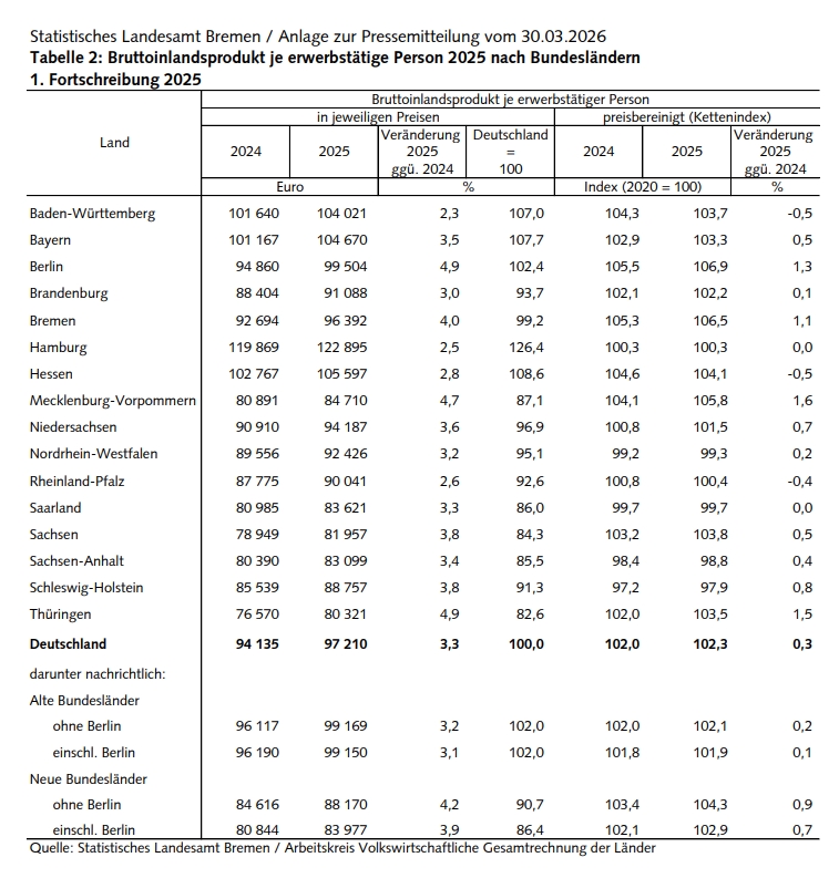 Tabelle Bruttoinlandsprodukt je erwerbstätige Person 2025 nach Bundesländern.