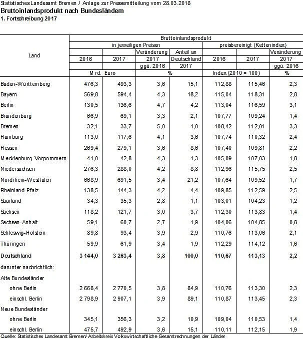 Das Bruttoinlandsprodukt (BIP) im Land Bremen stieg im Jahr 2017 nominal um 5,0 Prozent gegenüber 2016. Preisbereinigt entspricht das einem Anstieg von 3,3 Prozent. Das bundesdeutsche Wirtschaftswachstum nahm gegenüber dem Vorjahr nominal um 3,8 Prozent und preisbereinigt um 2,2 Prozent zu. Dies teilt das Statistische Landesamt Bremen als Mitglied des Arbeitskreises "Volkswirtschaftliche Gesamtrechnungen der Länder" mit.