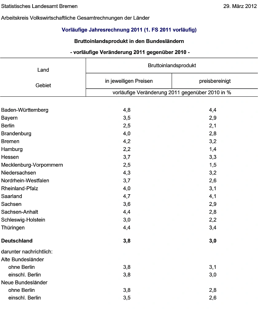 Nach Mitteilung des Statistischen Landesamtes Bremen als Mitglied des Arbeitskreises „Volkswirtschaftliche Gesamtrechnungen der Länder“ (AK VGR dL) stieg das Bruttoinlandsprodukt im Land Bremen im Jahr 2011 nominal um 4,2 % gegenüber 2010. Preisbereinigt entspricht das einem Anstieg von 3,2 %. Das bundesdeutsche Wirtschafts-wachstum nahm gegenüber dem Vorjahr nominal um 3,8 % zu und preisbereinigt um 3 %.
