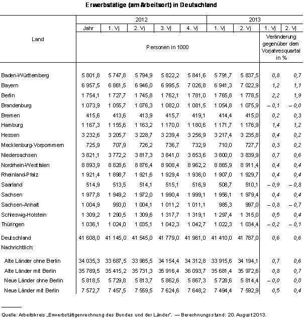 Zahl der Erwerbstätigen im ersten Halbjahr 2013 im Bundesland Bremen weiter gestiegen