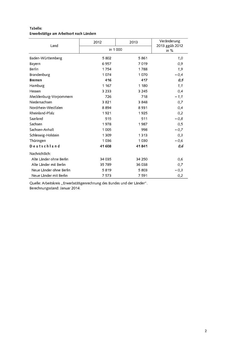 Nach Mitteilung des Statistischen Landesamtes und vorläufigen Berechnungen des Arbeitskreises "Erwerbstätigenrechnung des Bundes und der Länder" (AK ETR) kam es im Jahr 2013 zu einem robusten Plus bei der Zahl der Erwerbstätigen im Land Bremen. Für das gesamte Jahr 2013 stieg die Zahl der Erwerbstätigen mit Arbeitsort in Bremen im Jahresdurchschnitt um 0,5 Prozent, insgesamt waren rund 417.500 Personen erwerbstätig. Im Jahr 2012 waren es noch rund 415.600 Personen. Damit wurde im Jahresschnitt 2013 ein historischer Höchstwert erreicht. Das Jahr 1998 war das Jahr mit der geringsten Erwerbstätigenzahl für Bremen in Höhe von rund 379.600 Personen.