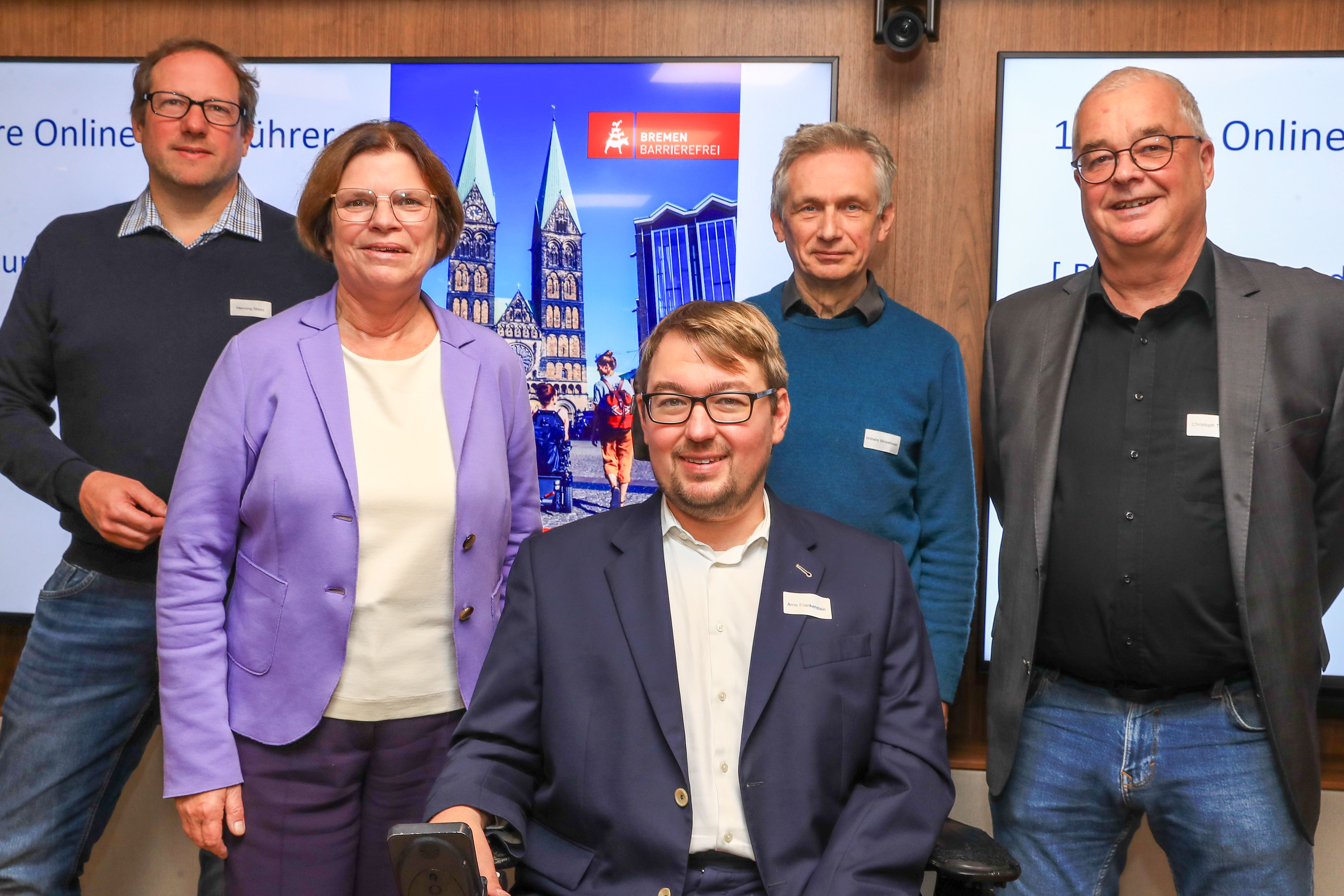 Gratulierten zum zehnjährigen Bestehen des Stadtführer barrierefreies Bremen: (v.l.) Henning Sklorz (Abteilungsleiter Bremen Online bei der WFB Wirtschaftsförderung Bremen GmbH), Senatorin Kristina Vogt (Senatorin für Wirtschaft, Häfen und Transformation), Landesbehindertenbeauftragter Arne Frankenstein, Wilhelm Winkelmeier (Geschäftsführer SelbstBestimmt Leben e.V.), Christoph Theiling (Geschäftsführer p+t planung).