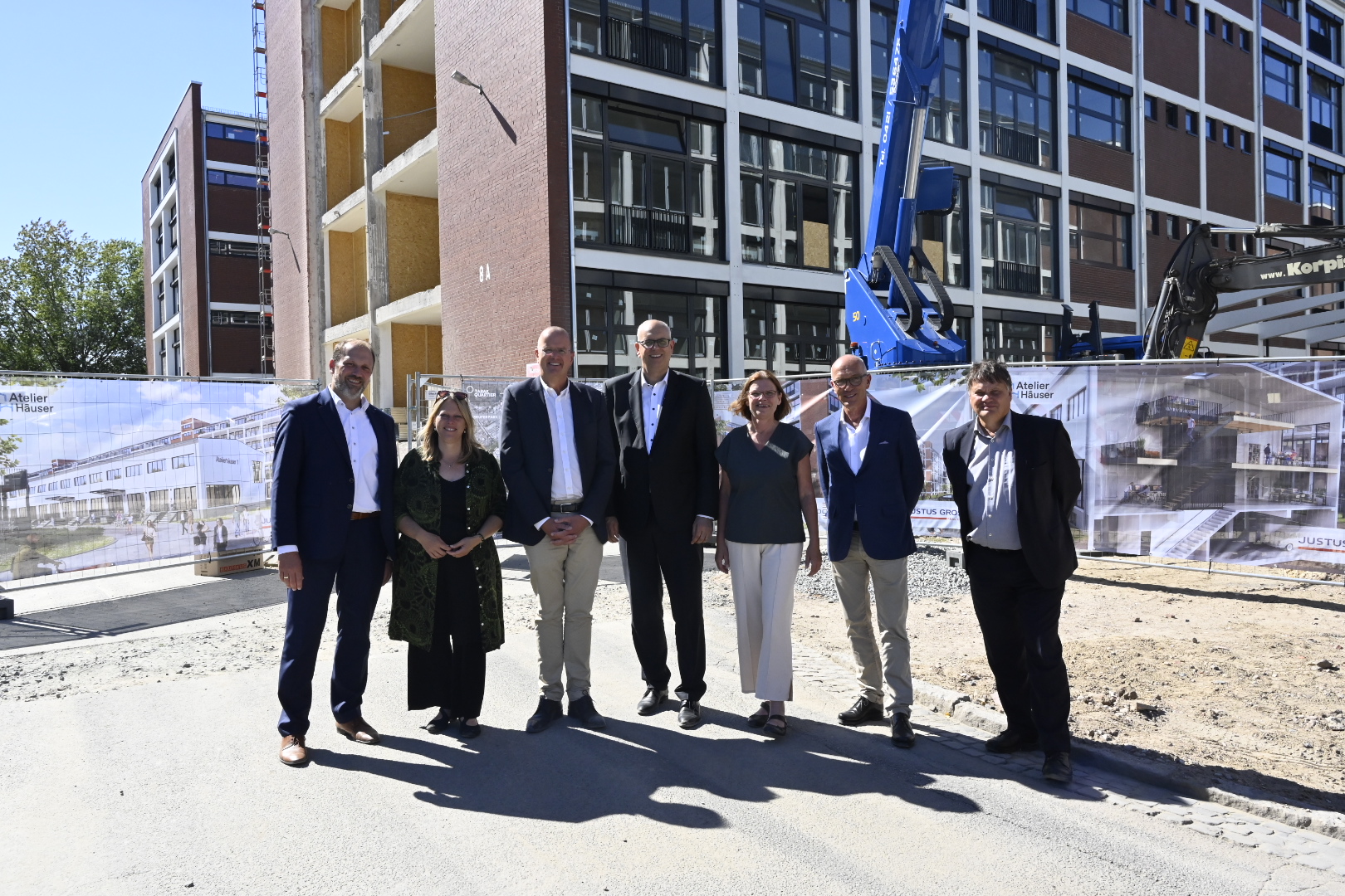 31.08.2022Ab jetzt sind drei wichtige Bauvorhaben im neuen "Tabakquartier'" in Bremen-Woltmershausen offiziell auf der Zielgeraden: Für den "Alten Tabakspeicher II", die "Speicherlofts" und die "AtelierHäuser" feierten die Investoren Justus Grosse Real Estate GmbH und LEG-Niedersachsen GmbH heute Richtfest. Für den Senat waren Bürgermeister Andreas Bovenschulte, Bausenatorin Maike Schaefer, Wirtschaftssenatorin Kristina Vogt und Finanzsenator Dietmar Strehl dabei. Bis zum Sommer kommenden Jahres werden Justus Grosse und LEG über 140 Millionen Euro in die drei Projekte investieren und 222 Wohnungen bauen sowie insgesamt nahezu 23.000 Quadratmeter Fläche für Büros und Gewerbe erschließen.