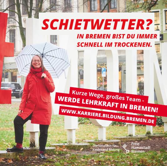 Das Land Bremen ist mit seinen beiden Städten Bremerhaven und Bremen ein attraktiver Lebensort und ein toller Platz für eine Karriere im Bildungswesen. Erneut haben sich weit über 200 Menschen für ein Referendariat am Landesinstitut für Schule im Land Bremen ab dem 1. Februar 2025 beworben. Damit ist der Zustrom ungebrochen. Und für alle, die ihre Ausbildung beendet haben, bietet die Senatorin für Kinder und Bildung, Sascha Karolin Aulepp, ab sofort auf dem neuen Karriereportal neue Perspektiven. Mit wenigen Klicks zum neuen Job in Schule? Das funktioniert jetzt unter www.bildung.bremen.de