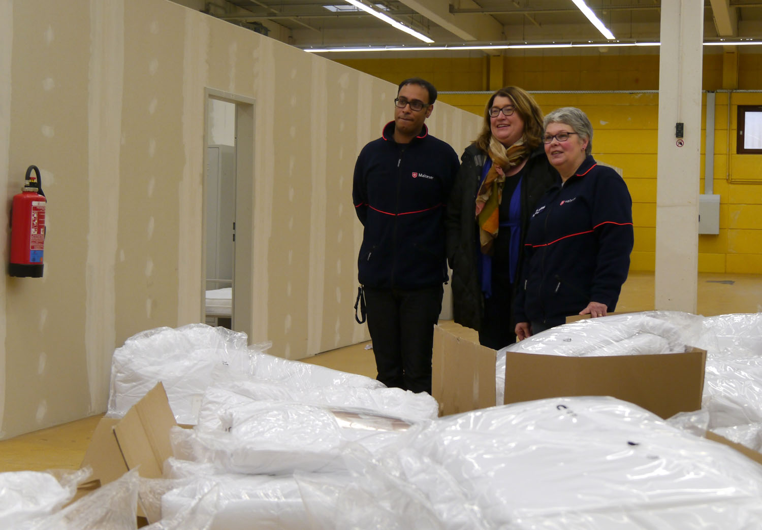 Senatorin Stahmann übergibt den Baumarkt an die Malteser: Ahmed Aref (ganz links) wird die Gemeinschaftsunterkunft künftig leiten, Angelika Gabriel (mitte) ist Geschäftsführerin beim Malteser Hilfsdienst